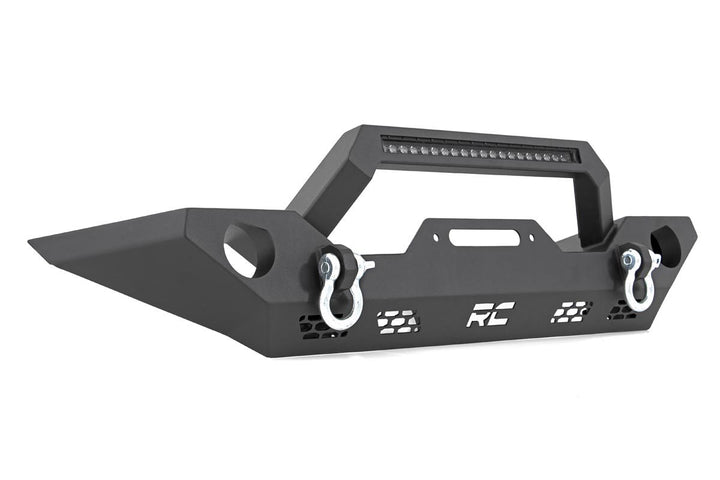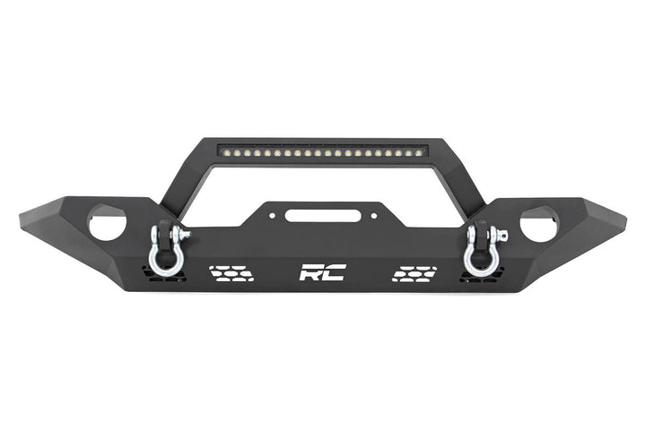 Transform the look and capabilities of your Jeep with Rough Country's Full Width LED Winch Bumper. This durable, steel bumper features aggressive good looks and packs plenty of features for traversing off-road obstacles. Rough Country's LED Winch Bumper features a full-width design that fits in nicely with the factory flare or aftermarket modifications. The tapered ends and high-clearance design offer plenty of clearance for optimum approach angles and articulation.This front bumper features a built-in Rough Country 20in Single-Row Black-Series LED Light Bar, providing 7,200 lumens and 100 watts of forward-facing illumination to help you easily see the trail ahead. This bumper is also designed to retain your factory fog lights, with two OE fog light ports that feature an ?ǣangry eyes?ǥ look. Each bumper also features multiple recovery options, such as a set of d-ring shackles and a winch mounting plate that can fit any standard-size winch.